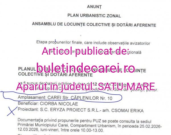Primăria Carei anunță Dezbatere Publică pentru construirea de ansamblu de locuințe și spații comerciale pe strada Căplenilor nr.10 adică la adresa locuinței fostului primar, evazionistul Kovacs Eugen. Buletin de Carei a semnalat faptul că s–a încercat evitarea Dezbaterii Publice prin amplasarea unui panou pe poarta imobilului de parcă toți careienii ar avea drum pe acea stradă. Mai mult, primul panou cu anunțul pentru Dezbatere Publică era al Primăriei Satu Mare…