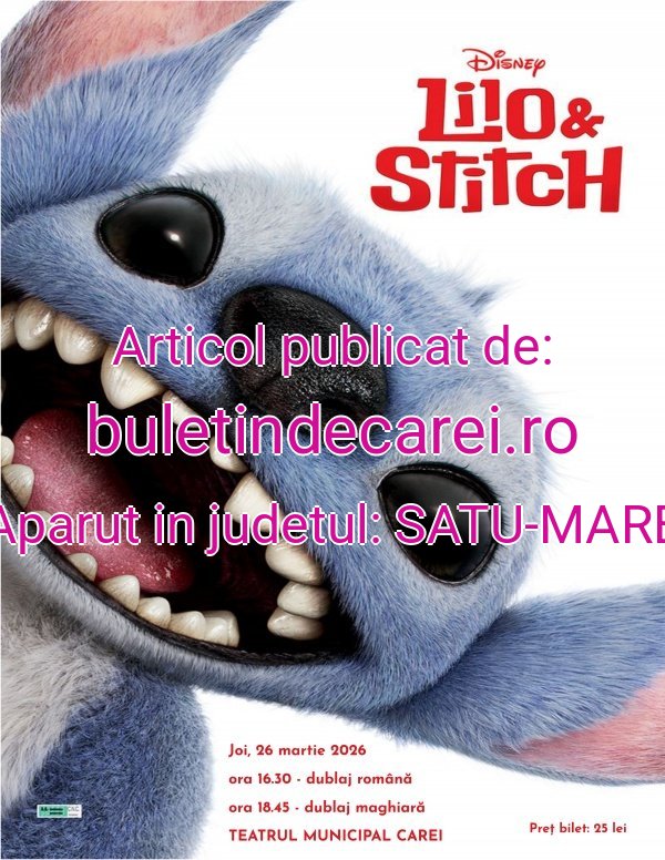 Joi, 26 martie 2026, la Teatrul Municipal Carei, va fi proiectat filmul pentru copiiLilo și Stitch . De la ora 16.30 vizionarea se va face cu dublaj în limba română, iar de la ora 18.45 cu dublaj în limba maghiară. Preț bilet: 25 lei.
